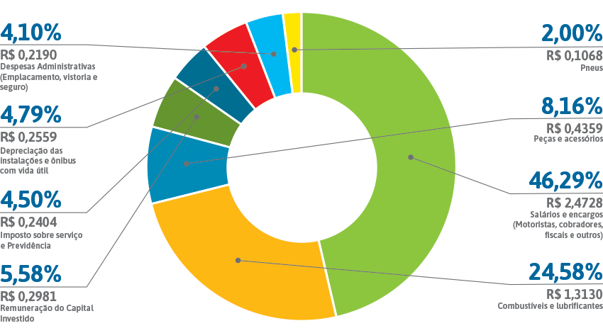 Atualmente, os maiores percentuais, ou seja, os que mais impactam no valor da passagem, são os gastos com pessoal (46,29%) e com combustíveis e lubrificantes (24,58%). Dos atuais R$ 5,34 (tarifa técnica), R$ 2,47 vão para pagar os funcionários (motorista, cobrador e fiscal) e R$ 1,31 vão para abastecer os ônibus.