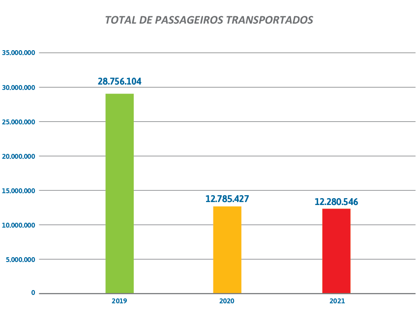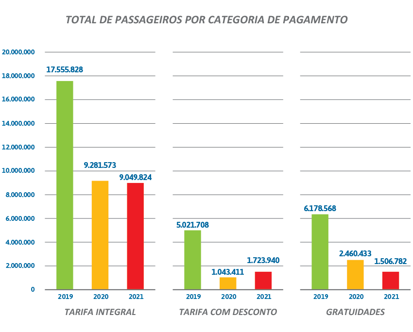 A variável que determina o valor da passagem é o IPK, o Índice de Passageiros Pagantes Transportados por Quilômetro. Ou seja, quanto mais pessoas usam o transporte, a tendência é que ele se torne mais barato. Porém, nos últimos anos, em razão da pandemia, o índice caiu de forma acentuada e ainda não deu sinais de recuperação. A queda de passageiros, que ocorria em cerca de 4% ao ano, foi reduzida em mais de 50% nos últimos dois anos. Em 2019, o número total de passageiros transportados foi de 28.756.104; em 2020, esse número caiu para 12.785.427 (-55%); e, em 2021, 12.280.546 (-58%).